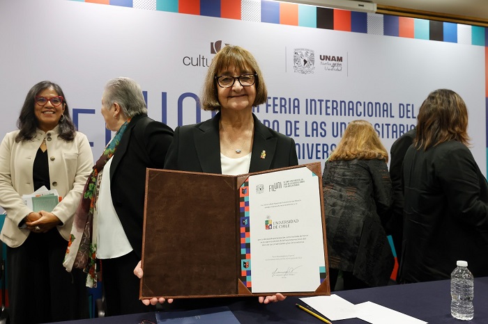 La Rectora Devés -quien además en esta ceremonia recibió el reconocimiento a nombre de la UCHILE como invitada de honor del encuentro, titulado “El español, el idioma de la cultura y la ciencia”- destacó que “nos ha parecido importante concurrir con una delegación amplia, asumiendo el rol de embajada cultural de Chile para traer a México la diversidad de voces y memorias que conforman nuestro país”.